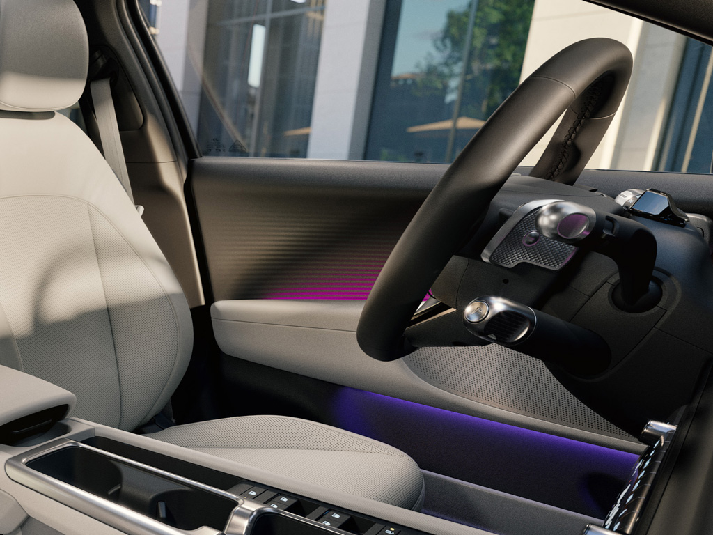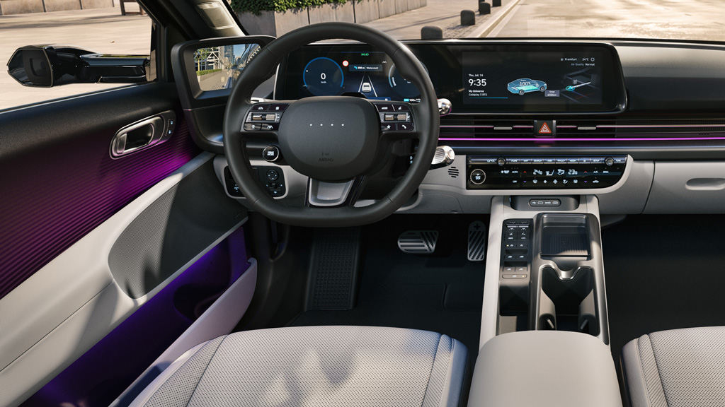 Uue IONIQ 6 salongis loovad luksuslikuma õhkkonna uue kujunduse saanud rool ja täiustatud materjalidega viimistletud uksed. Funktsionaalsuse parandamiseks on muudetud keskkonsooli elementide paigutust ning kasutusmugavuse lisamiseks on kliimaseade saanud suurema ekraani.